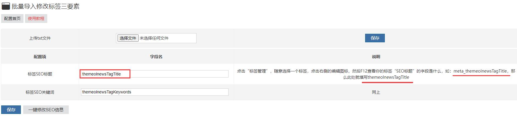 當這個txt文件生成之后,我們命名為“a.txt”(命名隨意取,這里只是舉個例子),然后我們到插件設置里把這個a.txt文件上傳進去(注意:txt文件中的tag id要求是真實存在的,這個好理解,也就是先有標簽,才能有標簽的SEO信息)。